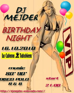 16 10 2010 r DJ MEJDER BIRTHDAY NIGHT w La Cuabana Tabakiera Zapraszam na imprezę urodzinową wiele niespodzianek muzycznych nie zabraknie BONEY M czy Dr ALBANA poprostu jesdnym słowem wspaniałe klimaty właśnie tej nocy